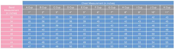 Using your band and chest measurements, determine your bra size using the chart diagram.